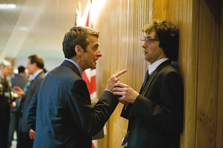 The 2009 British film In the Loop is a perfect example of this sort of referential dilemma. A relentless lampooning of the political process leading up to the Iraq War, it follows a small-time British politician—Minister for International Development Simon Noster—as he struggles to escape his televised comment that "war in the Middle East is unforeseeable." American and British politicians alike take notice of his statement, and he becomes a figurehead in the raging political battle over impending military action. Despite ample evidence that he is profoundly and inalterably "in over his head," he is hauled before the Future Planning Committee by America's most earnest Doves in a last-ditch effort to forestall the declaration of war, but Hawks from both sides of the Atlantic will let nothing stand in their way.